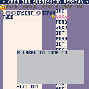 This is my submission to the cre8 jam and I'm happy the game is in a halfway decent state and can be played through completely. This version includes some basic commands and levels - I have some ideas for more levels, but had to struggle already to fit everything into a pico8 cart.